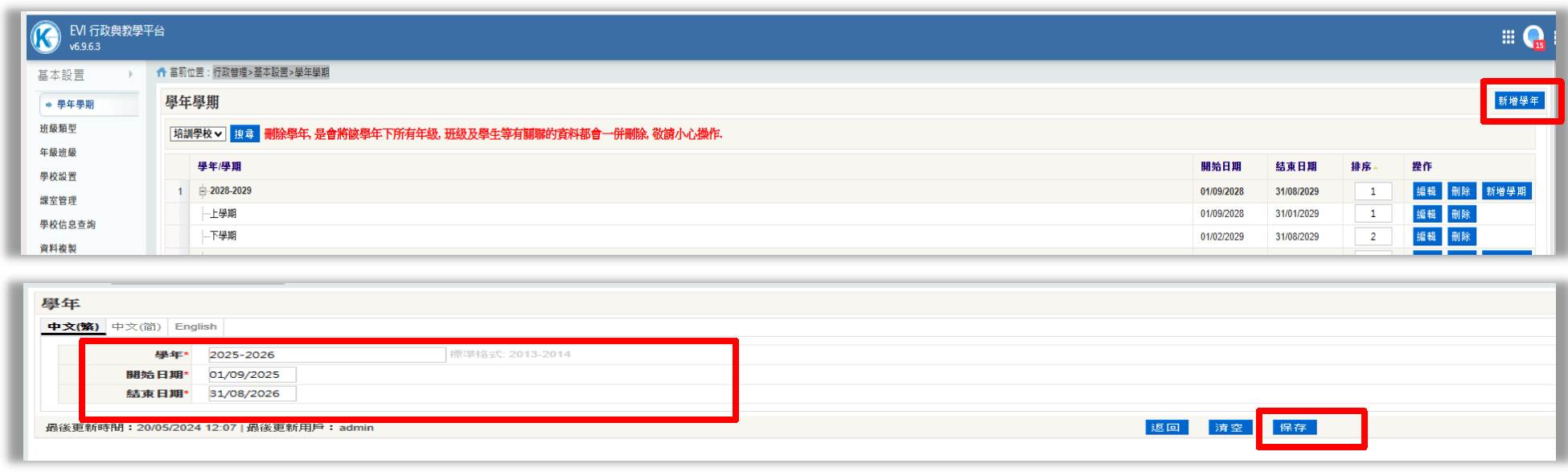 (行政管理系統)如何新增學年學期? Sue 2025年03月13日 04:11 更新於 1. 新增學年 在 行政管理>基本設置>學年學期 介面,點擊「新增學年」可新增學年信息 2.新增學期 新增學年信息後,可以點擊對應學年右方的「新增學期」按鈕,分別添加上下學期的信息 注:a. 如班級類型,年級班級和以往學年一致,可以通過資料複製,一鍵添加,如和以往有差異,可以參 考新增班級類型和新增年級班級的方式新增 b. 「編輯」按鈕可以修改原設置的名稱和時間等信息 c. 學年刪除僅限學年下未有學生信息,如有,系統會有提示,不允許刪除 d. 刪除學期信息,會把該學期下的課程編排作廢 評論 0 條評論 請登入寫評論。