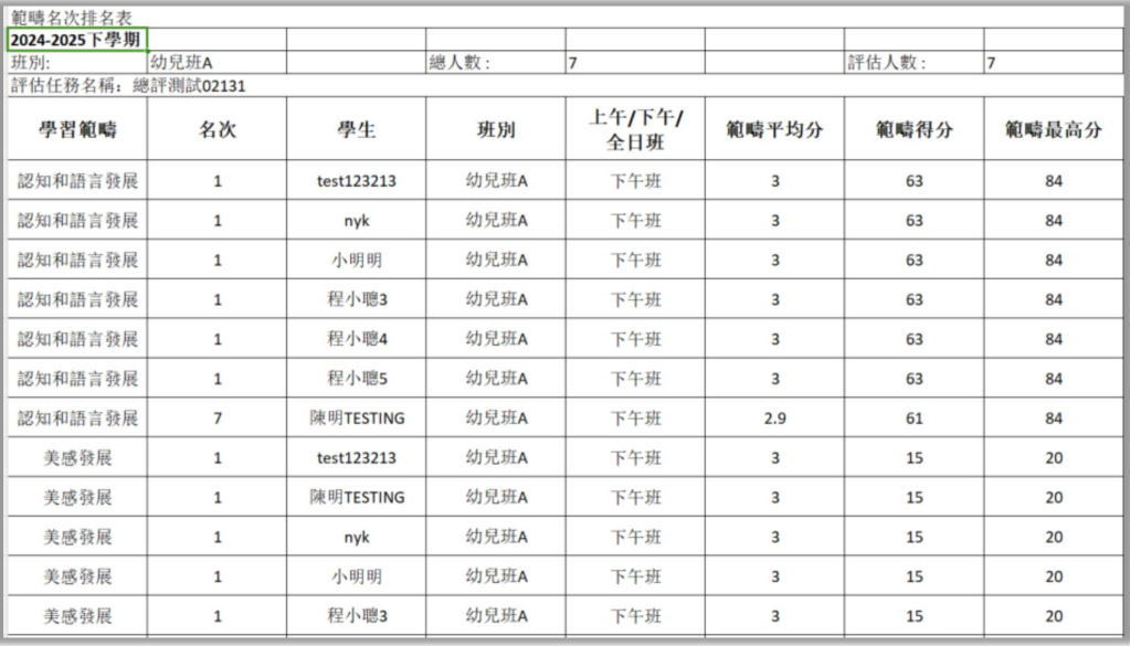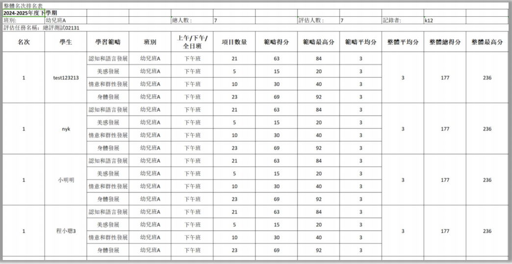 「整體名次排名表」顯示一班或多班學生整體表現排名以及每個主範疇下的表現