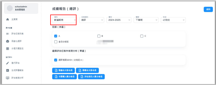 c. 在選單選擇對應的學年、學期和年級,勾選對應的班級(可多選,如學校想看整個年級報告表可 全選)
