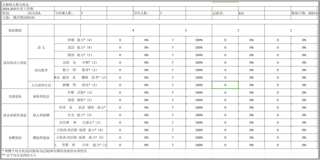 「評估項目人數分佈表」以每項評估項目作為統計對象,顯示各個表現等級下的人數分佈