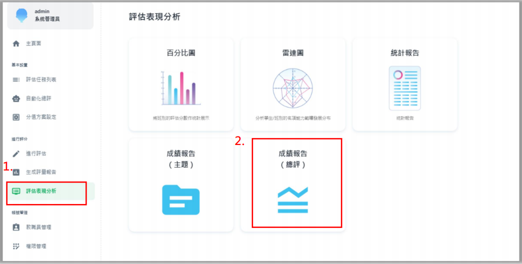 1. 在新評估系統-->評估表現分析 介面,點選「成績報告(總評)」