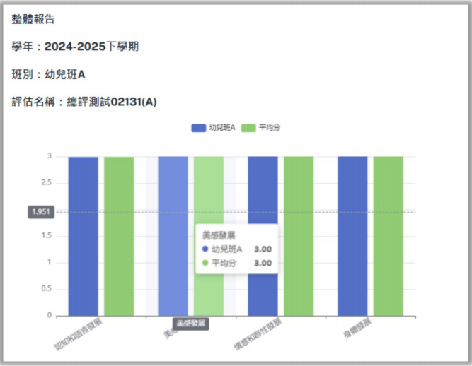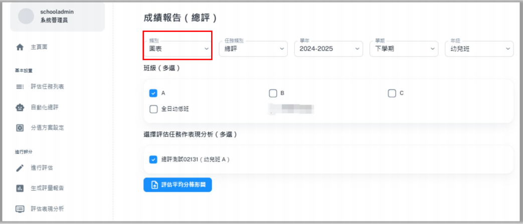 - 在新評估系統-->評估表現分析 介面,點選「成績報告(總評)」介面